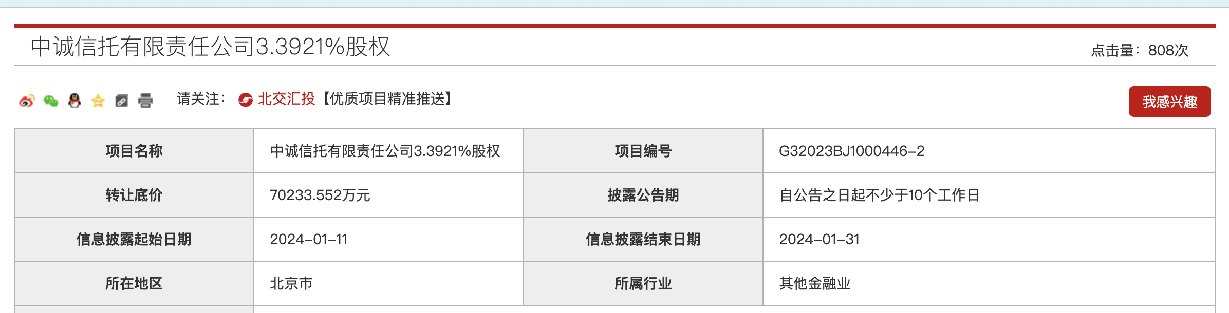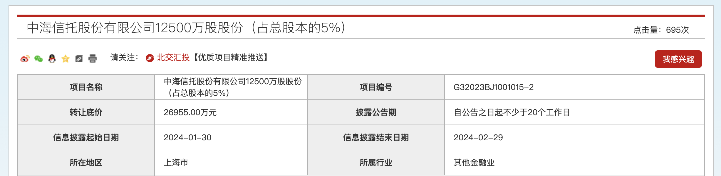 2023年12月29日,中海信托上述股权在北京产权交易所首次公开挂牌转让,转让底价为2.995亿元,信息披露至2024年1月26日。