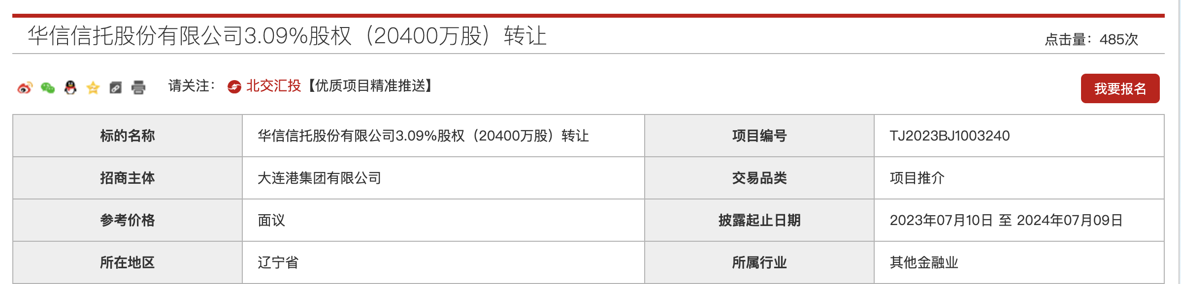大连港集团有限公司所持有的华信信托3.09%股权(2.04亿股)转让项目自2023年7月10日在北京产权交易所进行推介,价格面议,信息披露至2024年7月9日。项目信息介绍称,华信信托整体资产优质,虽有部分经营项目的风险暴露,但整体瑕不掩瑜,目前由大连市政府会同金融主管部门主导管理和化解风险;华信信托共有20家企业法人股东,大连港集团持股比例为3.09%,为第11大股东。