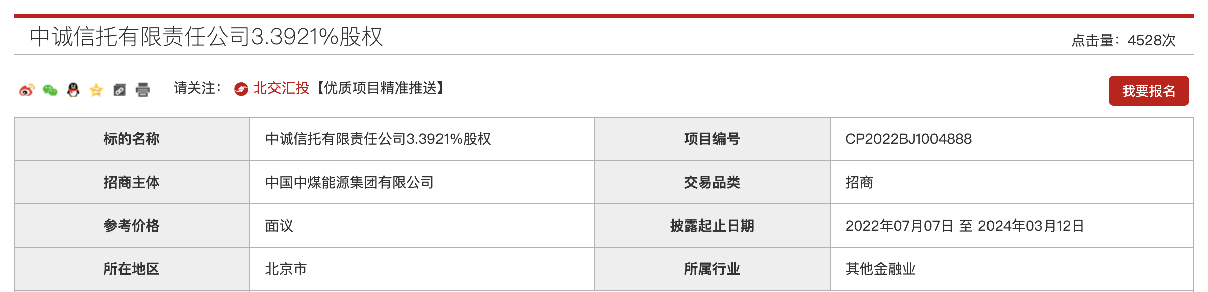 1月11日,中诚信托3.3921%股权在北京产权交易所再次挂牌转让,转让方为中国中煤能源集团有限公司(下称“中煤集团”),转让底价为7.0234亿元,较首次挂牌价打了9折,转让信息披露至2024年1月31日。