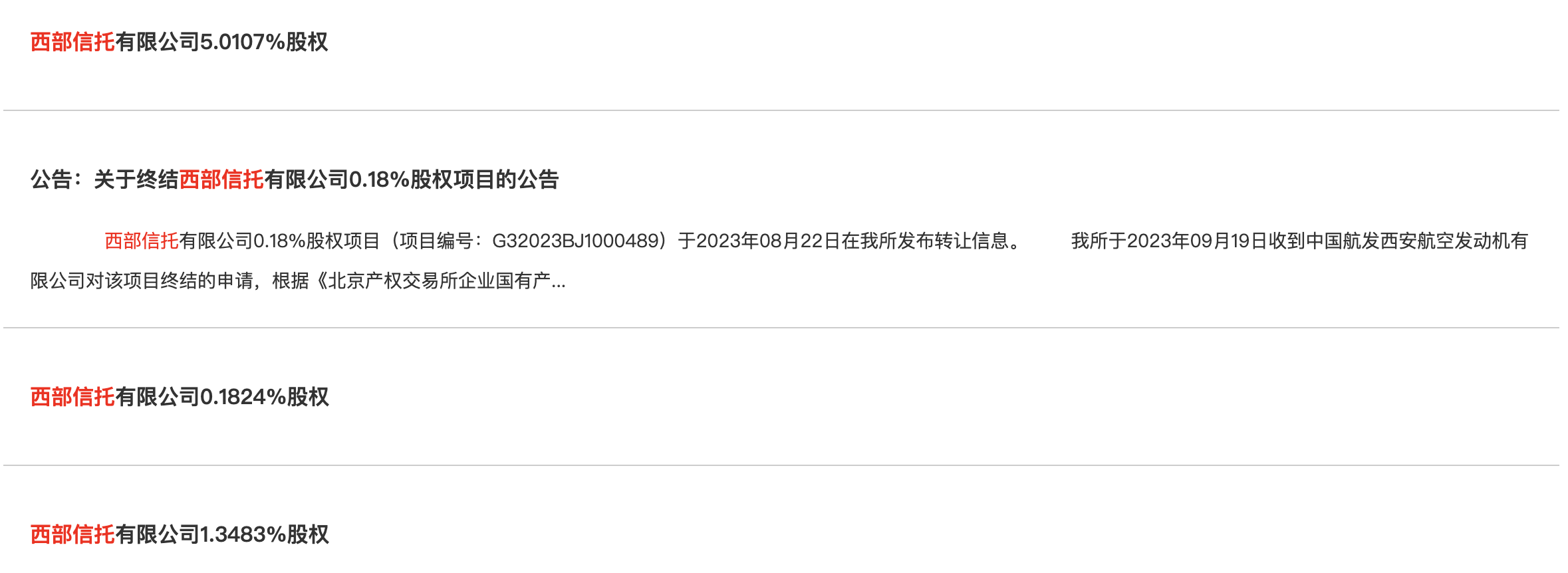 2023年9月15日,陕西飞机工业有限责任公司在北京产权交易所挂牌转让西部信托0.1824%股权,转让底价为1228.87万元。