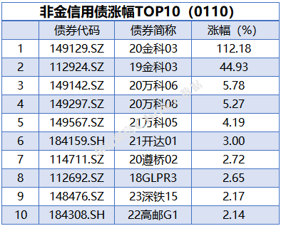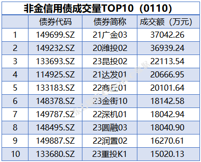 非金信用债方面,1月10日交易所成交量前三的债券为:21广金03、20潍投02、23昆投02;交易所涨幅前三的债券为:20金科03、19金科03、20万科06。